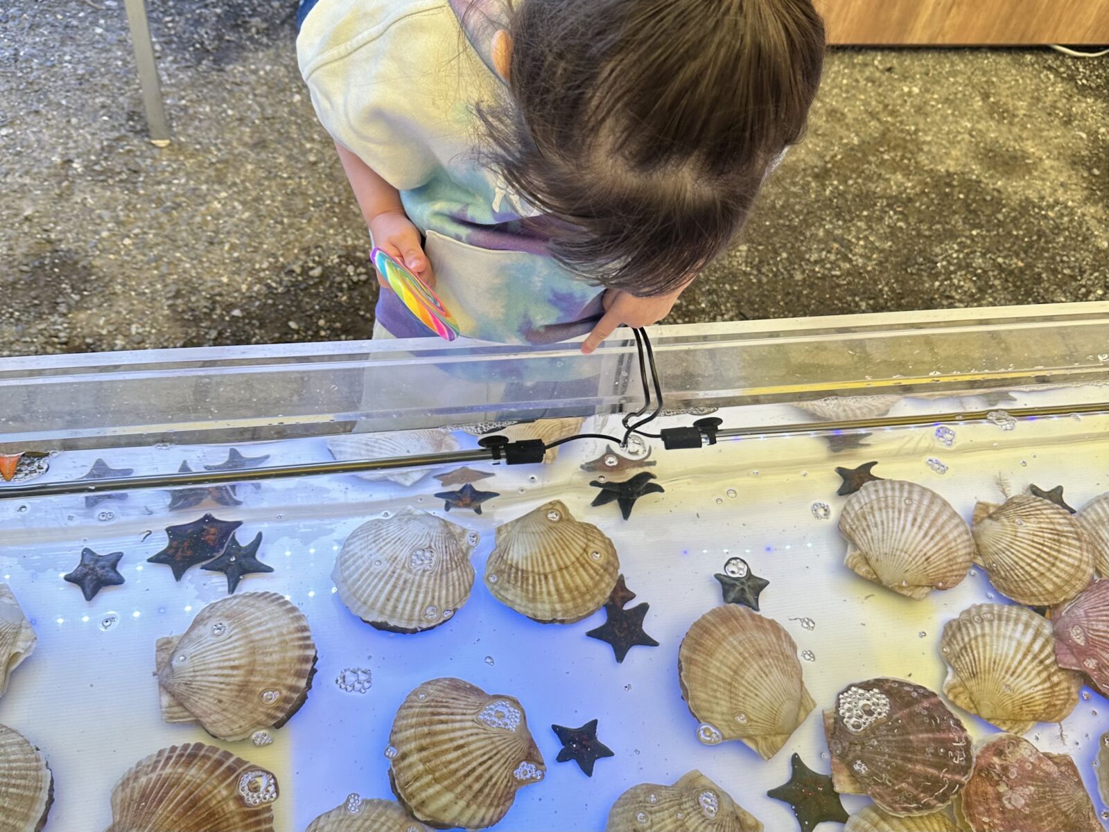 大きなタッチプールでは、ほたてを直接さわることができます。ヒトデやドチザメにも遭えるかも⁈